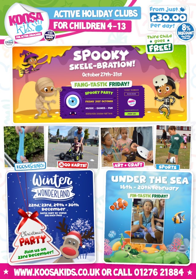 See the flyer below for booking for October half-term 2025, Christmas and February half-term 2026. For more information or to make a booking, contact KOOSA Kids on 01276 21884 or visit KOOSA Kids Website